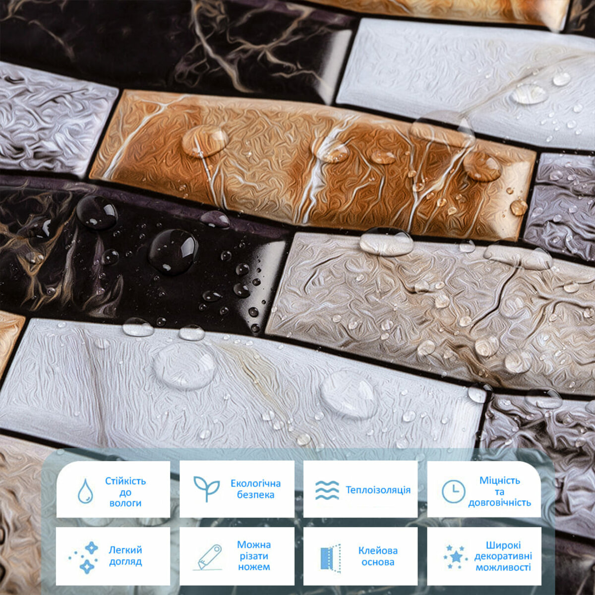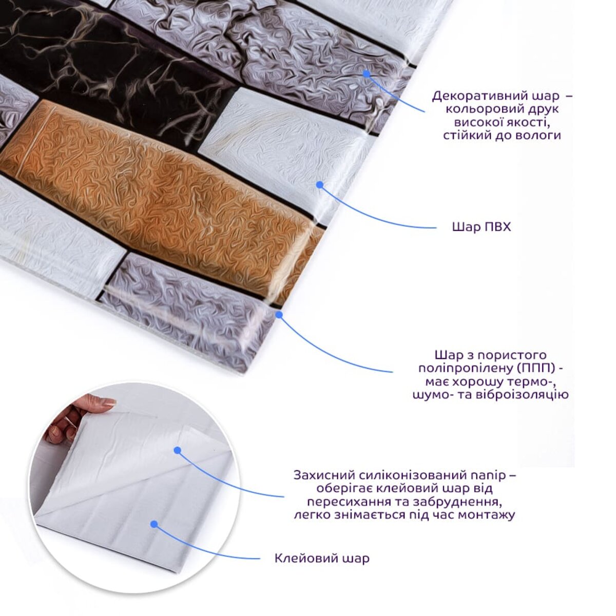 Самоклеючі декоративні панелі СПП – новинка у світі самоклейок. Це невеликі плитки із трендовим малюнком під натуральні матеріали. Прозорий захисний шар із поліуретану захищає покриття від стирання та механічних пошкоджень.