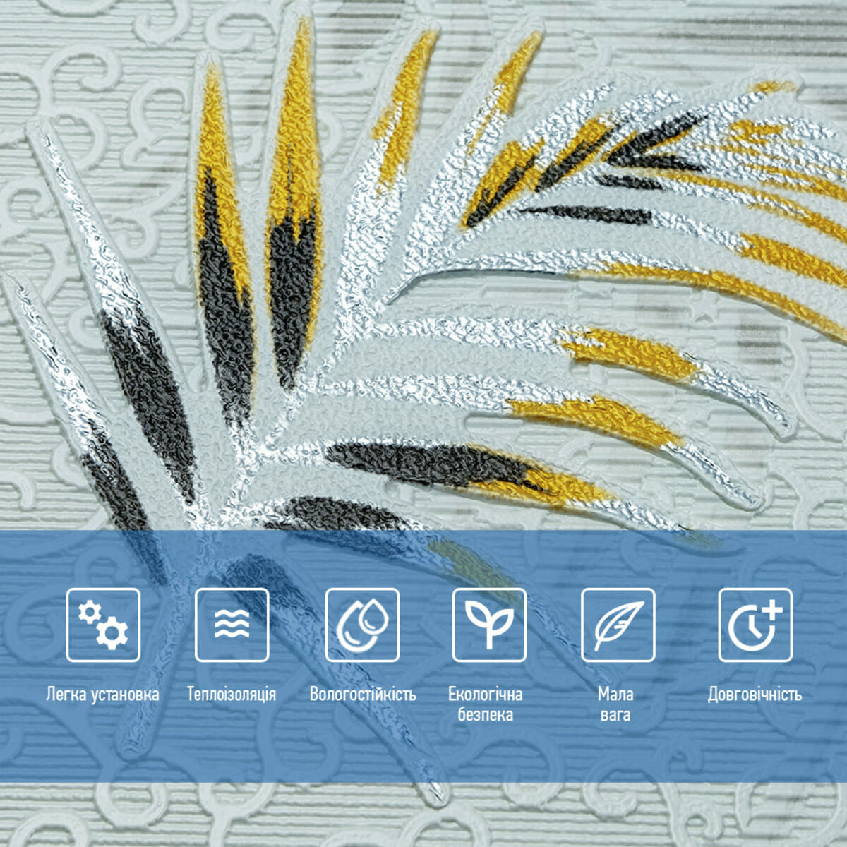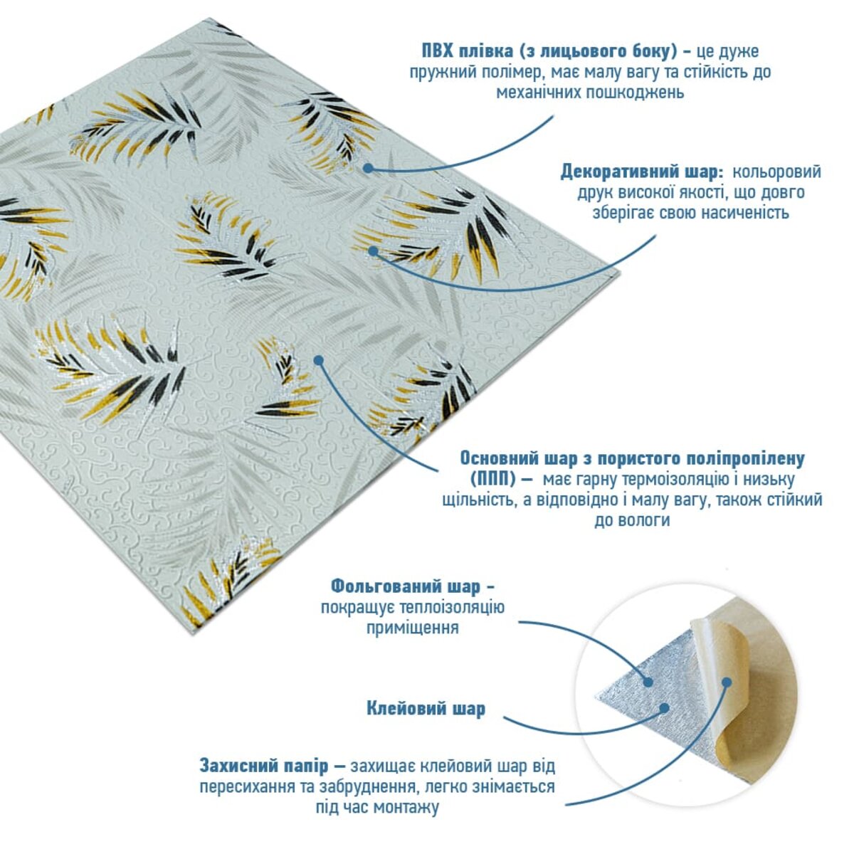 - Легкість монтажу: наявність клейового шару дозволяє встановити панелі без необхідності застосування додаткових матеріалів.