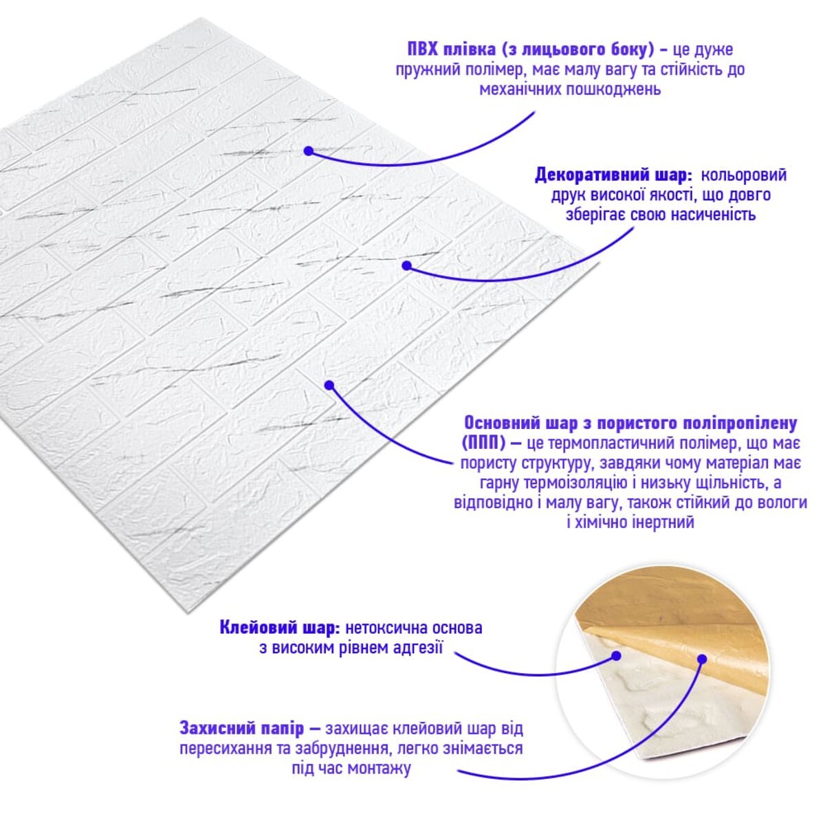 - Захисний папір – оберігає клейовий шар від пересихання та забруднення, легко знімається під час монтажу.