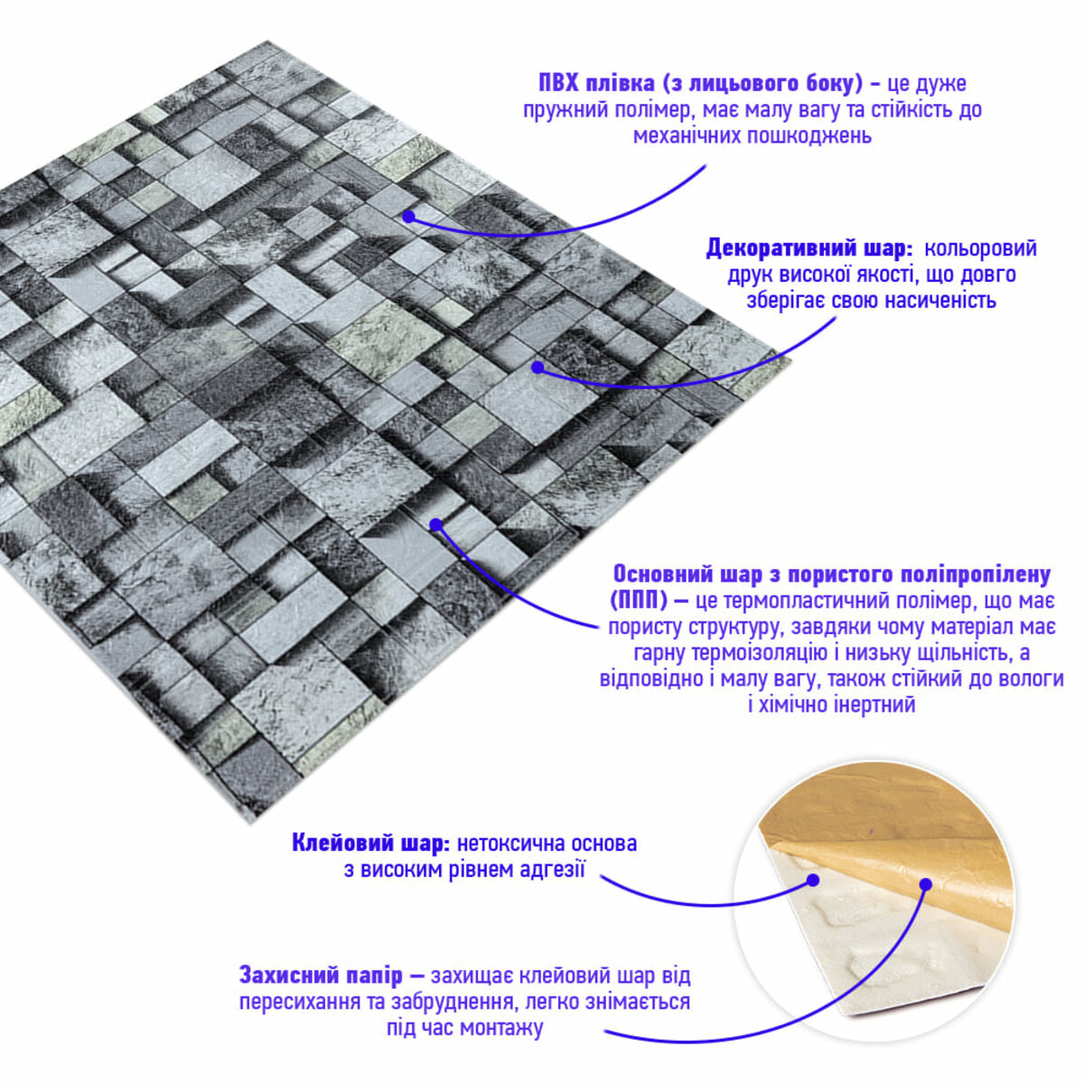 - Легкість монтажу: наявність клейового шару дозволяє встановити панелі без необхідності застосування додаткових матеріалів.