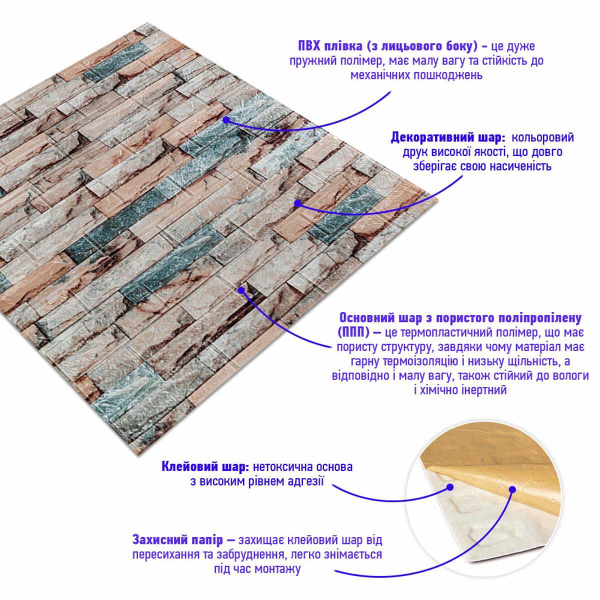 - Захисний папір – оберігає клейовий шар від пересихання та забруднення, легко знімається під час монтажу.