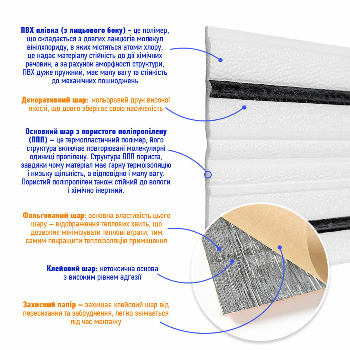 - Декоративний шар: кольоровий друк високої якості, що довго зберігає свою насиченість.