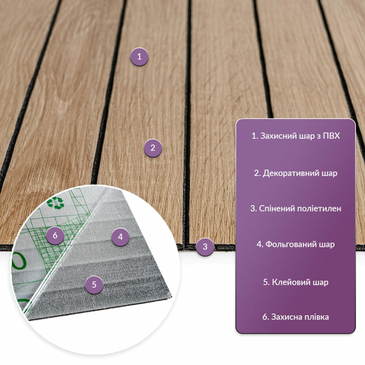 • Декоративний шар: плівка з кольоровим друком високої роздільної якості, яка повністю імітує фактуру природних матеріалів завдяки чіткому та деталізованому зображенню.