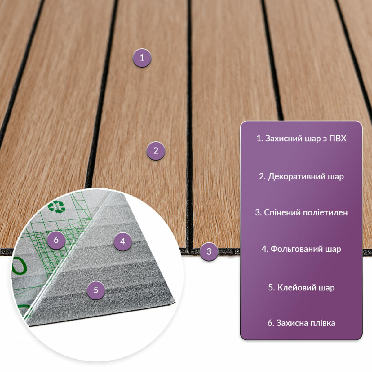 • Декоративний шар: плівка з кольоровим друком високої роздільної якості, яка повністю імітує фактуру природних матеріалів завдяки чіткому та деталізованому зображенню.