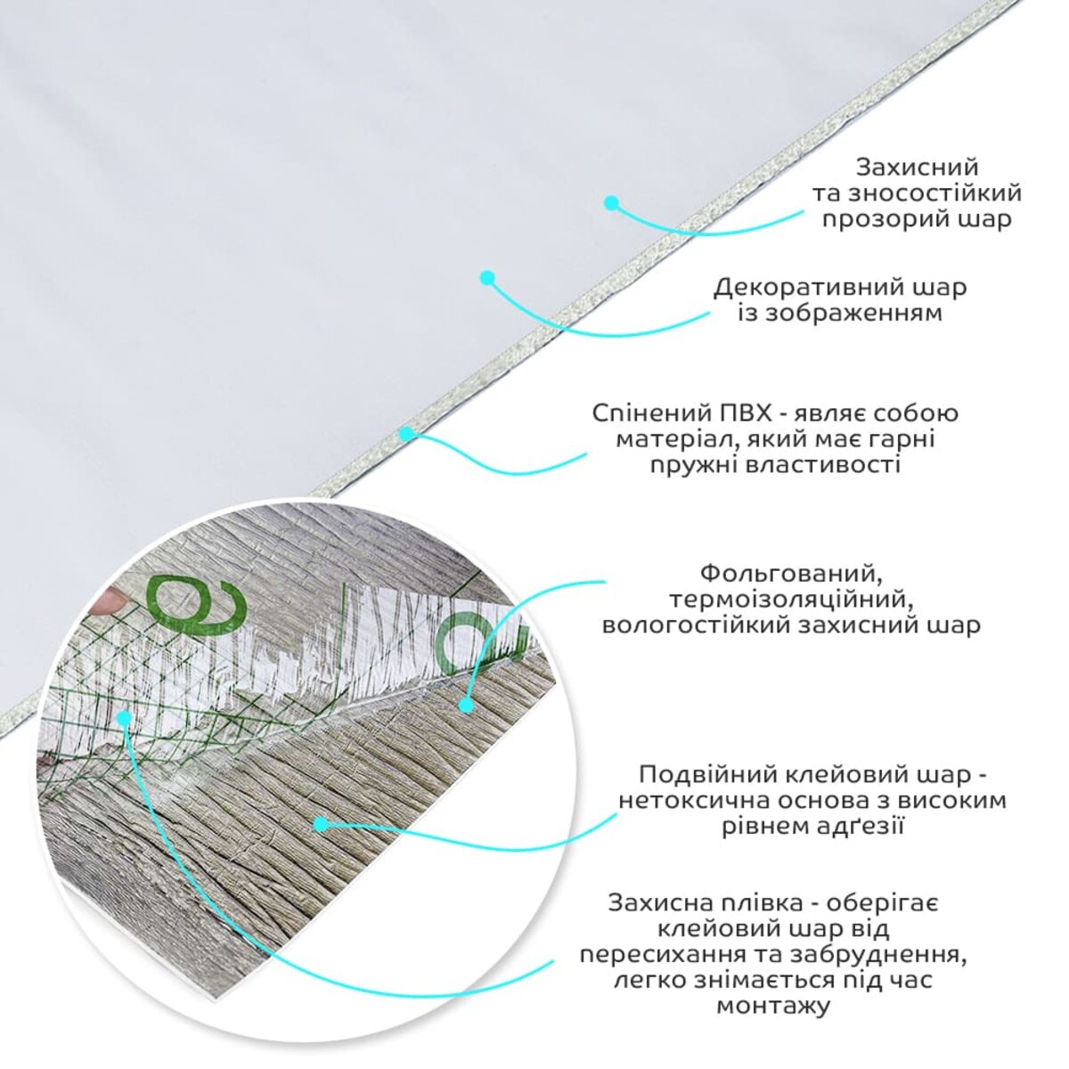 Захисна плівка – оберігає клейовий шар від пересихання та забруднення, легко знімається під час монтажу.