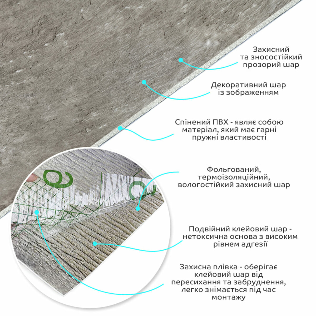 Основний шар із спіненого полівінілхлориду (ПВХ) – це полімер, що складається з довгих ланцюгів молекул вінілхлориду, в яких містяться атоми хлору, це надає матеріалу стійкість до дії хімічних речовин. ПВХ є аморфним полімером, така особливість будови робить його пружним та ударостійким, а завдяки стабілізаторам та пом’якшувачам, матеріал має малу вагу.