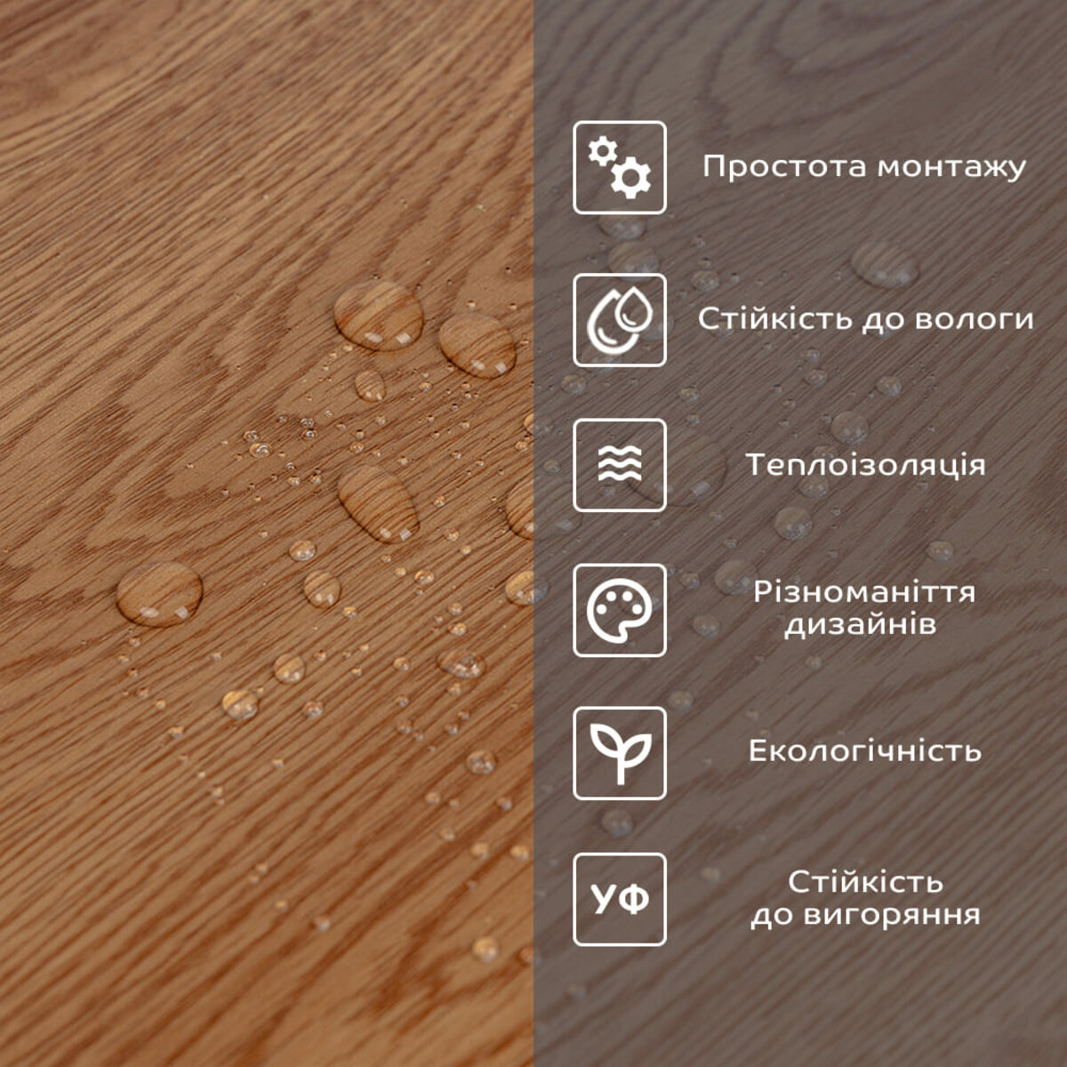 Полімерний шар, що захищає від потертостей та дрібних механічних пошкоджень, забезпечує довговічність використання, а УФ захист допомагає запобігти вигоранню, зберігаючи колір насиченим, за рахунок чого плитка довго має свій первісний естетичний вигляд.
