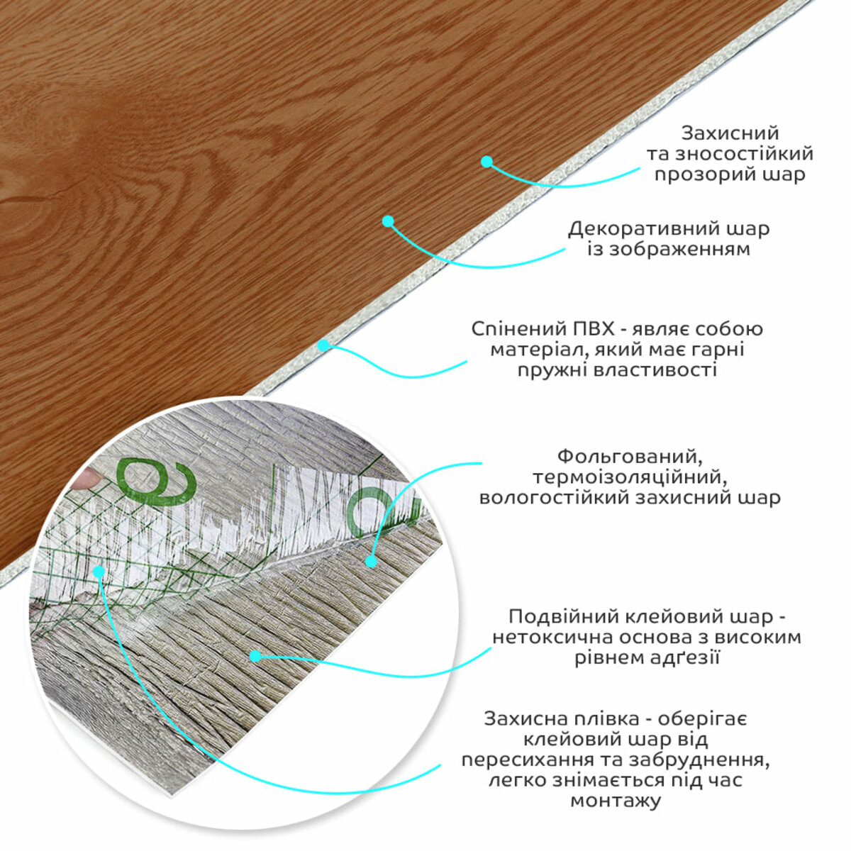 Захисна плівка – оберігає клейовий шар від пересихання та забруднення, легко знімається під час монтажу.
