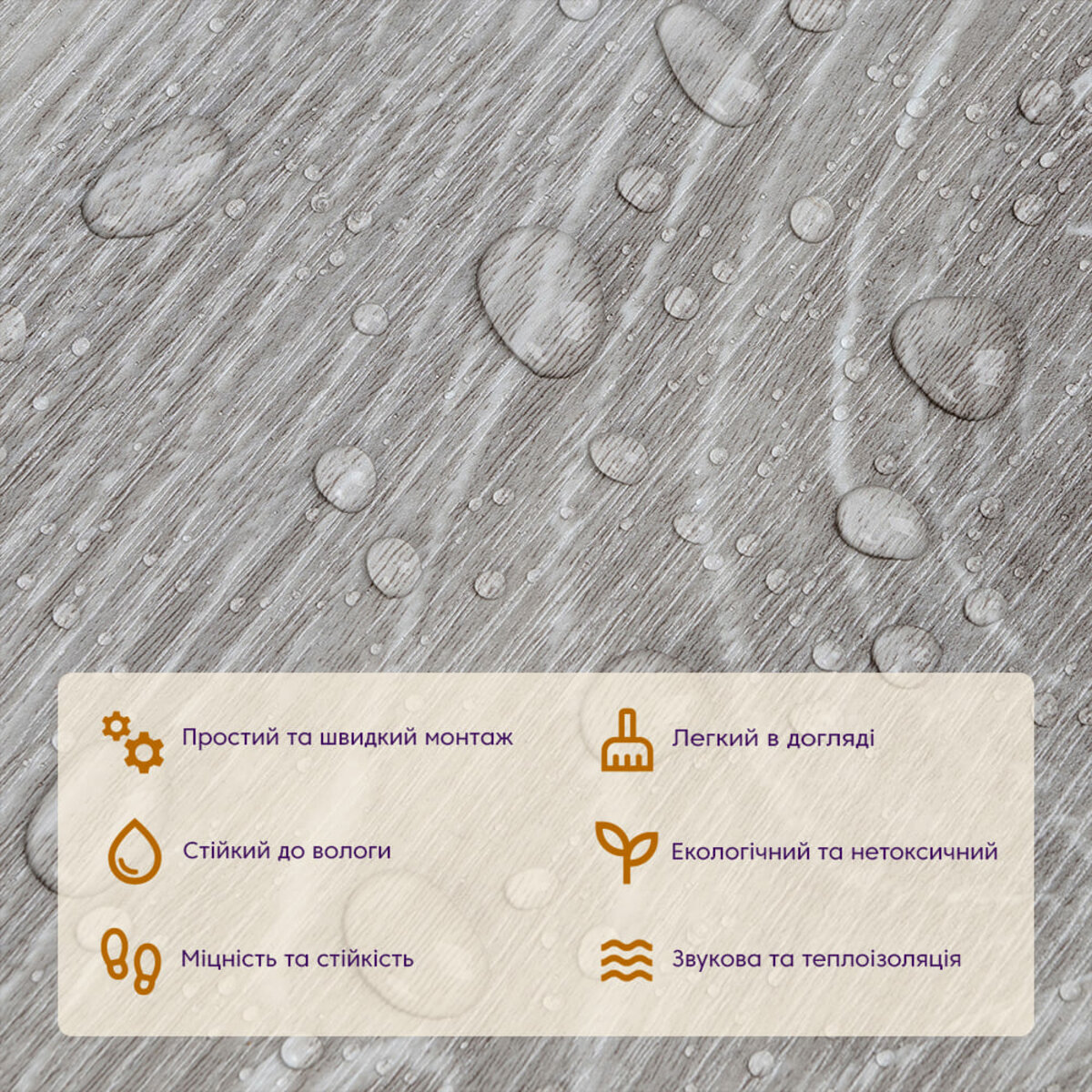 Стійкість до вологи: вінілова плитка під ламінат стійка до вологи, що робить її відмінним вибором для кухні та інших приміщень з підвищеною вологістю, матеріал стійкий також до впливу пари та до появи плісняви.