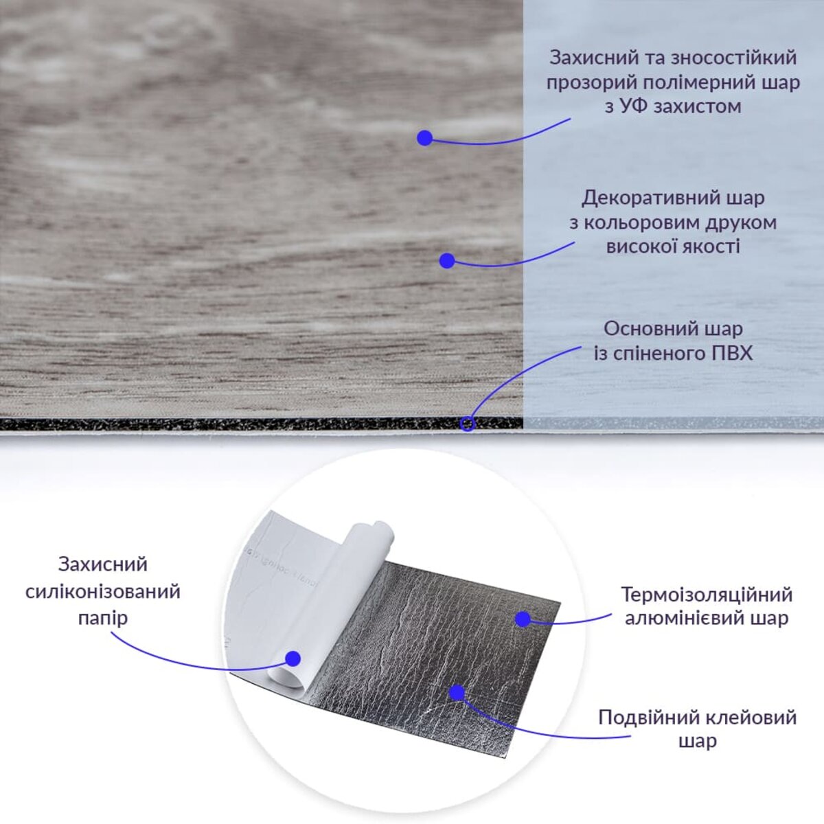Декоративний шар: плівка з кольоровим друком високої якості, яка повністю імітує фактуру природних матеріалів завдяки чіткому та деталізованому зображенню.