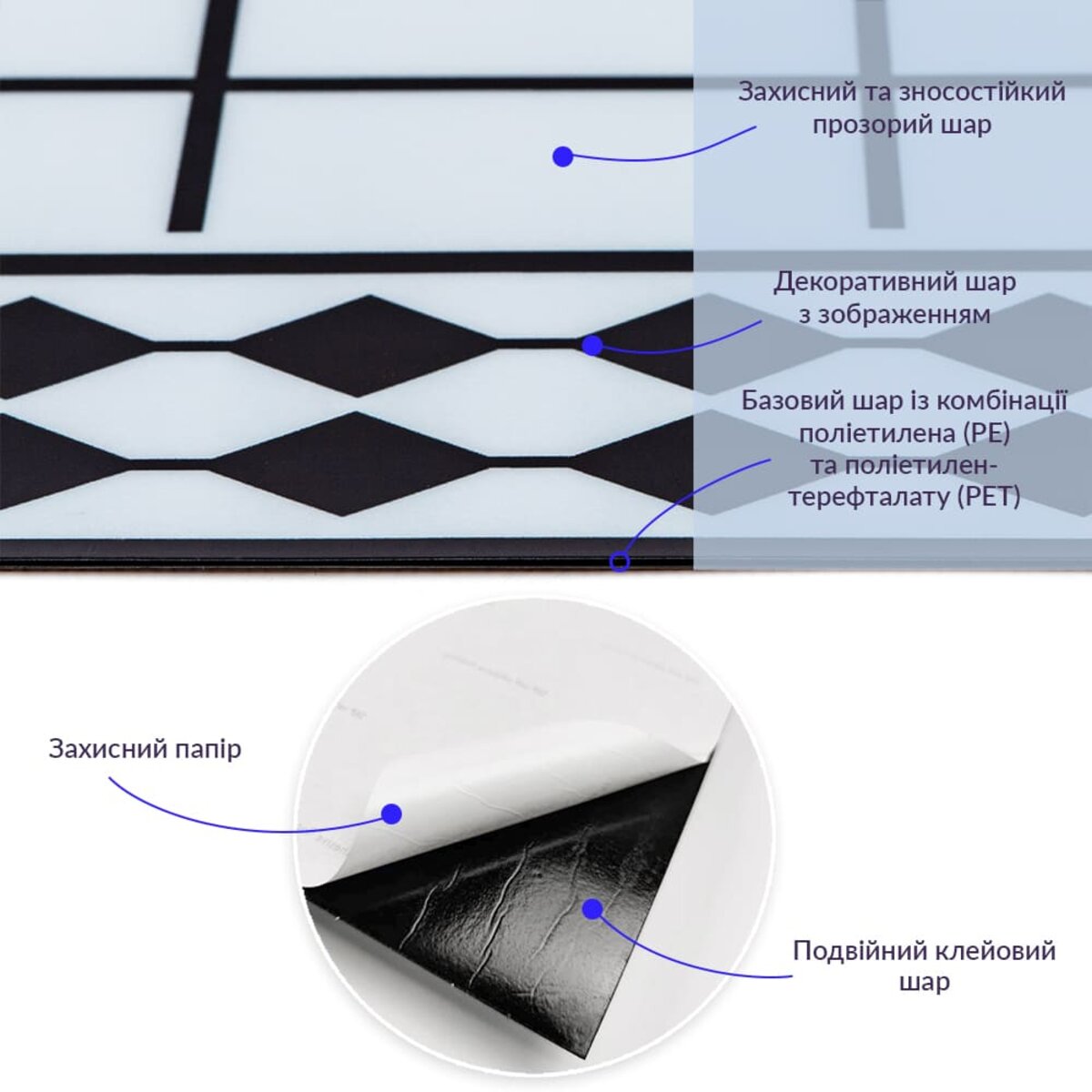 Захисний силіконізований папір – оберігає клейовий шар від пересихання та забруднення, легко знімається під час монтажу.