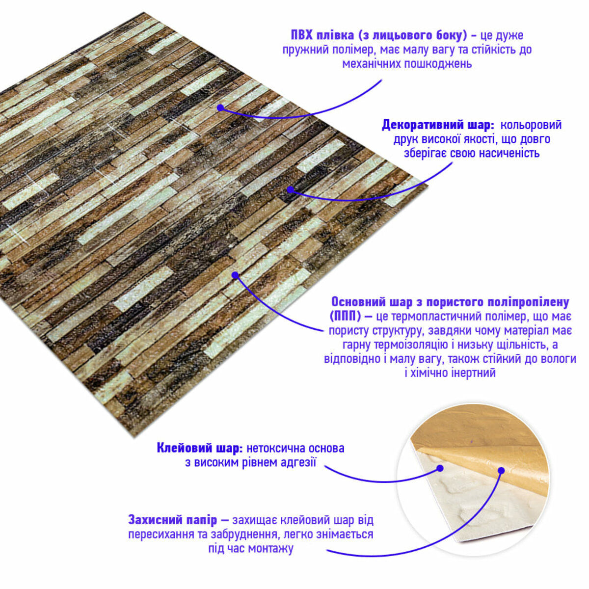 - Легкість монтажу: наявність клейового шару дозволяє встановити панелі без необхідності застосування додаткових матеріалів.