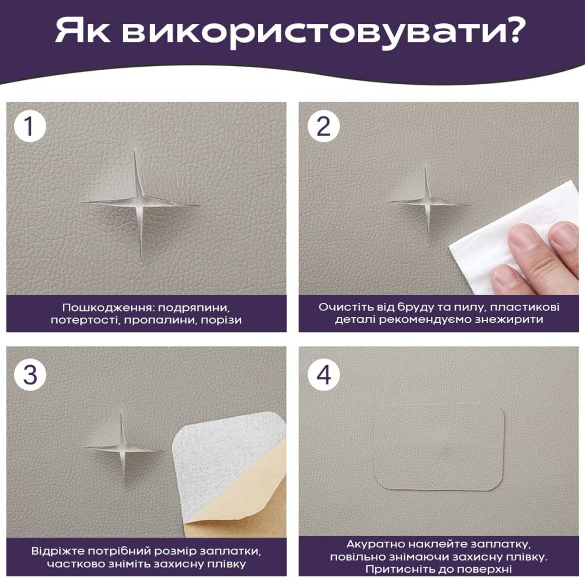 Призначення: ремонтно-оздоблювальні роботи та декорування. Матеріал може використовуватися у різноманітному ремонті дверей, м’яких меблів та стільців, деталей салонів автівок, сидінь велосипедів та мотоциклів, а також для реставрації шкіряно-галантерейної продукції та одягу.