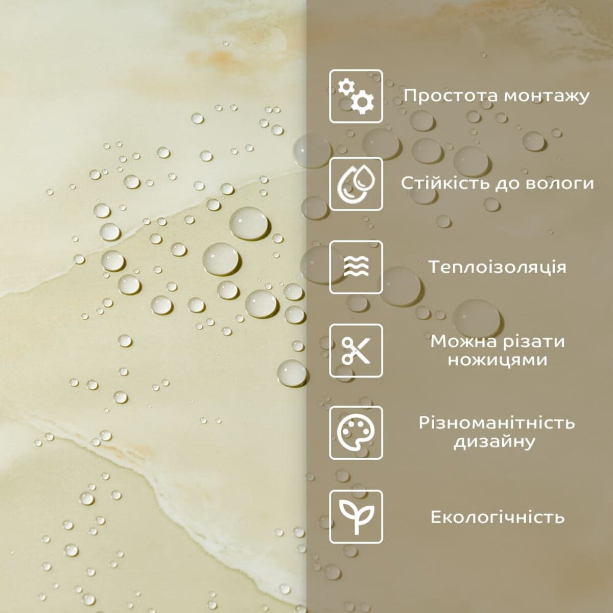 - 1. Легкість та міцність: плитка легка та міцна, що спрощує її логістику, установку та забезпечує довгий термін служби. Матеріал легкий в установці, можна різати ножицями чи монтажним ножем, не потребує додаткових матеріалів чи спеціалістів. Між смугами не розходиться, не роздмухується і не деформується. Відсоток обрізу становить 1%, що є найкращим показником для настінних покриттів;