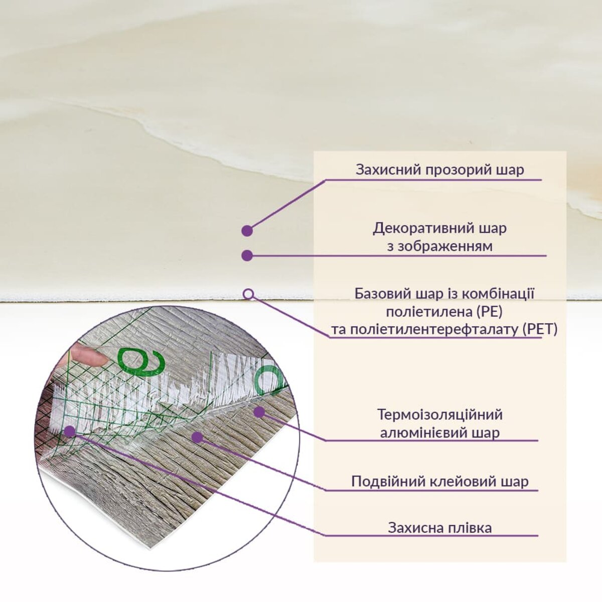 Матеріал: PE+PET, складається з суміші двох полімерів: поліетилену (PE) та поліетилентерефталату (PET)