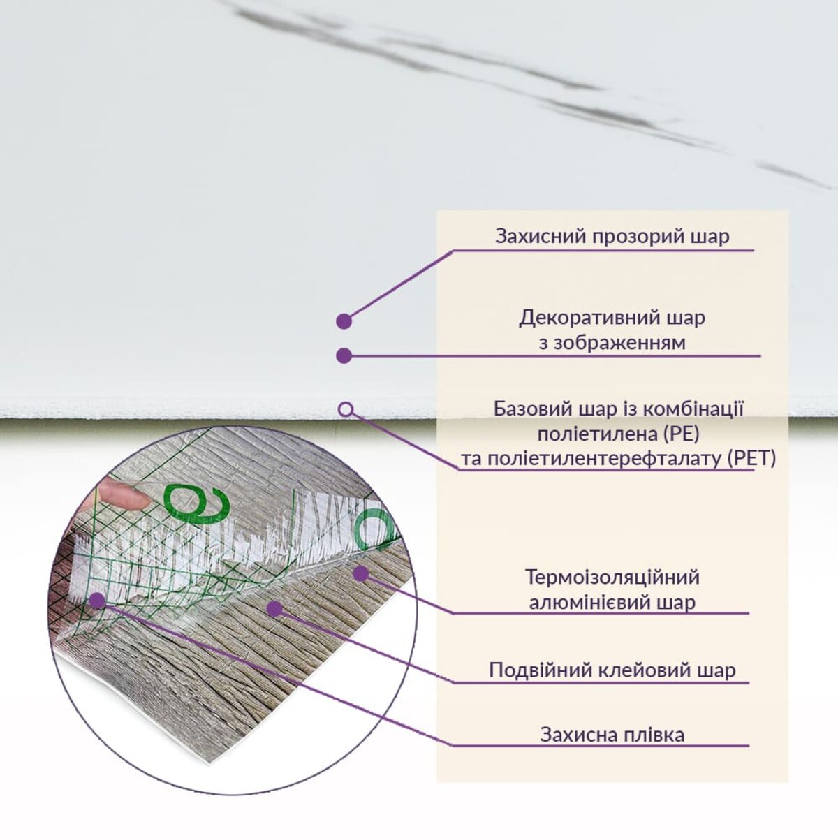 Матеріал: PE+PET, складається з суміші двох полімерів: поліетилену (PE) та поліетилентерефталату (PET)