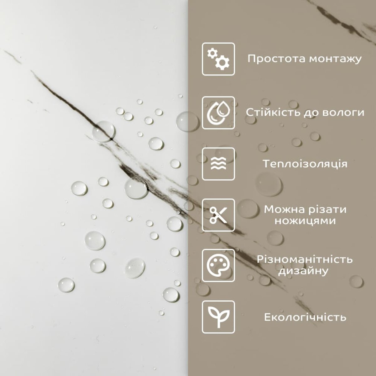 - 1. Легкість та міцність: плитка легка та міцна, що спрощує її логістику, установку та забезпечує довгий термін служби. Матеріал легкий в установці, можна різати ножицями чи монтажним ножем, не потребує додаткових матеріалів чи спеціалістів. Між смугами не розходиться, не роздмухується і не деформується. Відсоток обрізу становить 1%, що є найкращим показником для настінних покриттів;