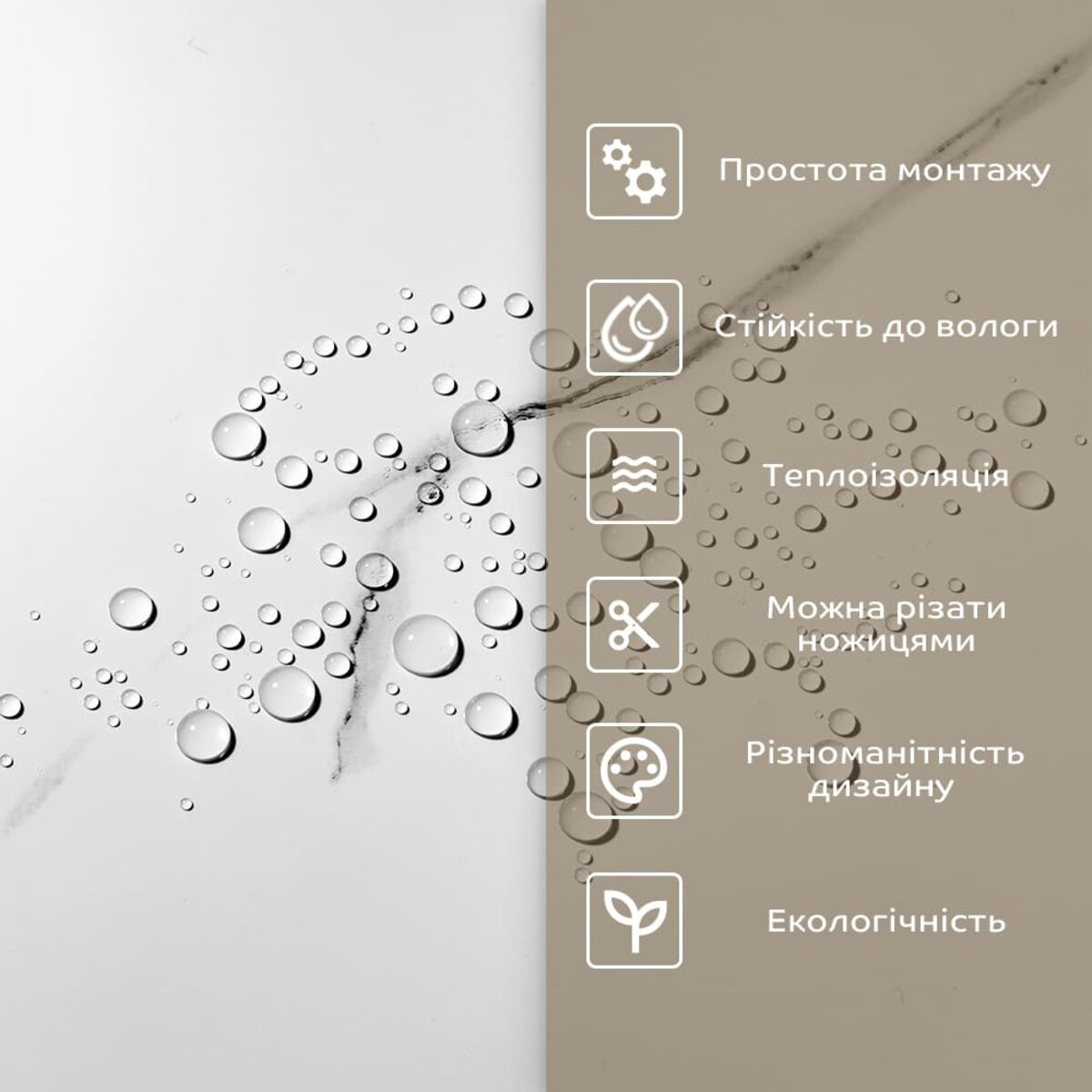 - 2. Стійкість до вологи: матеріал стійкий до впливу вологи та пари, а також до появи плісняви, що робить його придатним для використання у приміщеннях з високою вологістю, таких як ванни та кухні. Плитка підходить для створення фартуха кухні, можна клеїти біля плити на відстані не менше ніж 20-25 см;