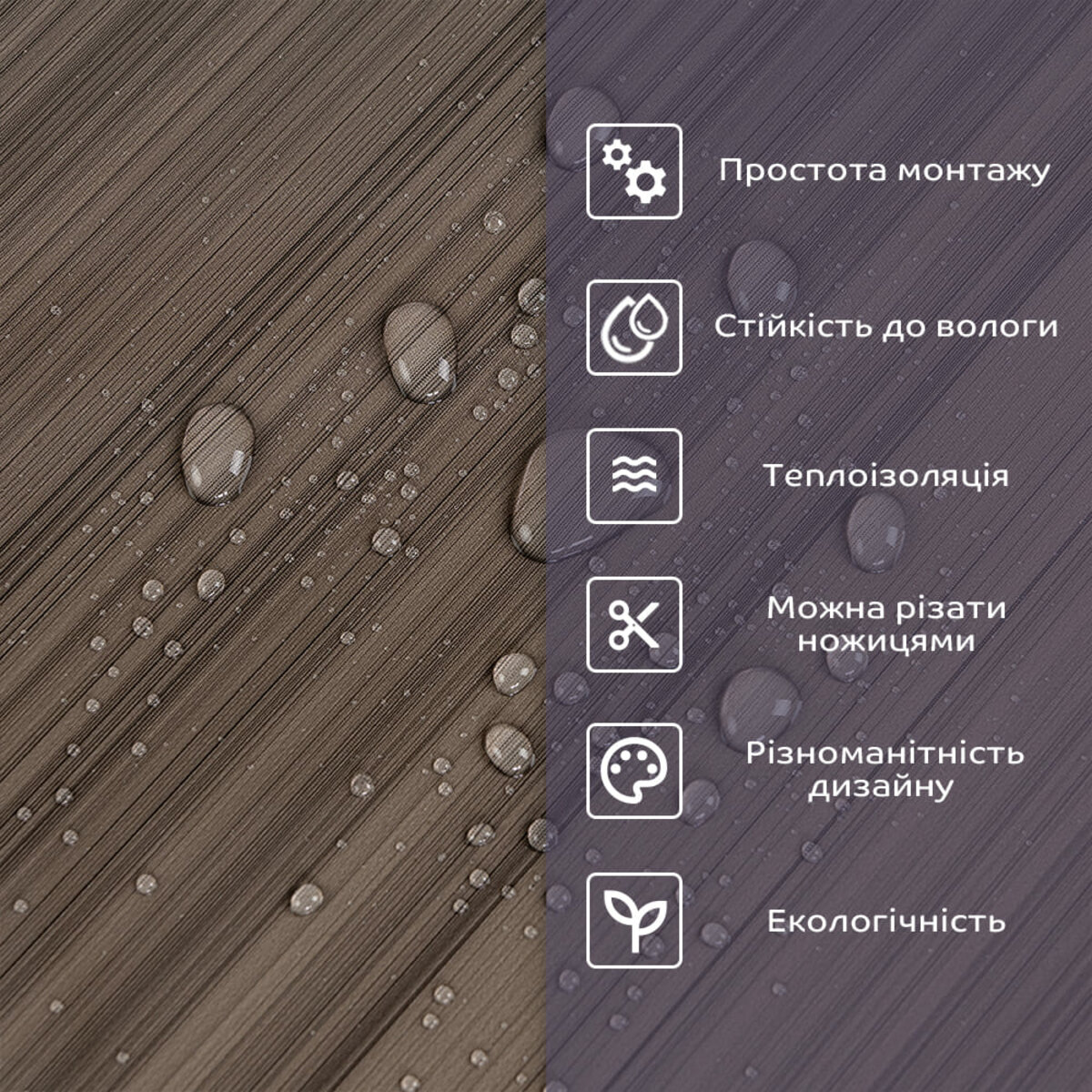 - 1. Легкість та міцність: плитка легка та міцна, що спрощує її логістику, установку та забезпечує довгий термін служби. Матеріал легкий в установці, можна різати ножицями чи монтажним ножем, не потребує додаткових матеріалів чи спеціалістів. Між смугами не розходиться, не роздмухується і не деформується. Відсоток обрізу становить 1%, що є найкращим показником для настінних покриттів;