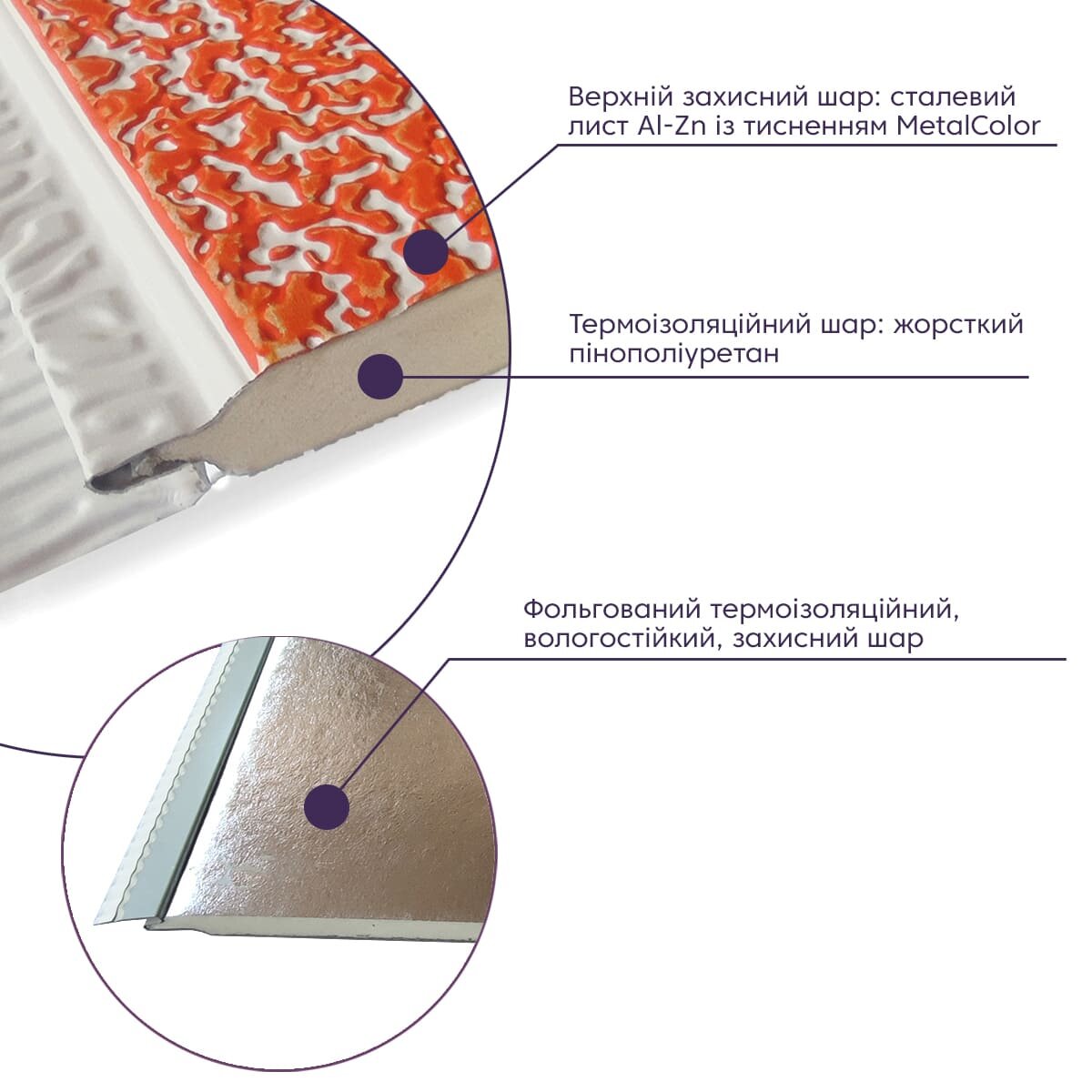 - Висока теплоізоляція: PU панелі мають високий коефіцієнт теплоізоляції, що дозволяє зберігати тепло в будівлі, зменшувати витрати на опалення та забезпечувати комфорт у внутрішньому приміщенні (25 мм пінополіуретану утеплюють тим же чином, що і 65 мм пінопласту).