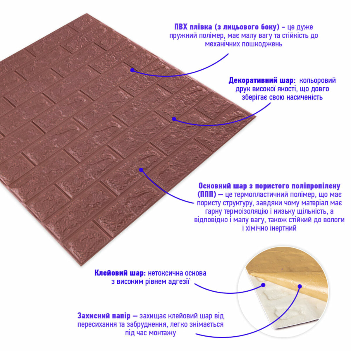 - Захисний папір – оберігає клейовий шар від пересихання та забруднення, легко знімається під час монтажу.