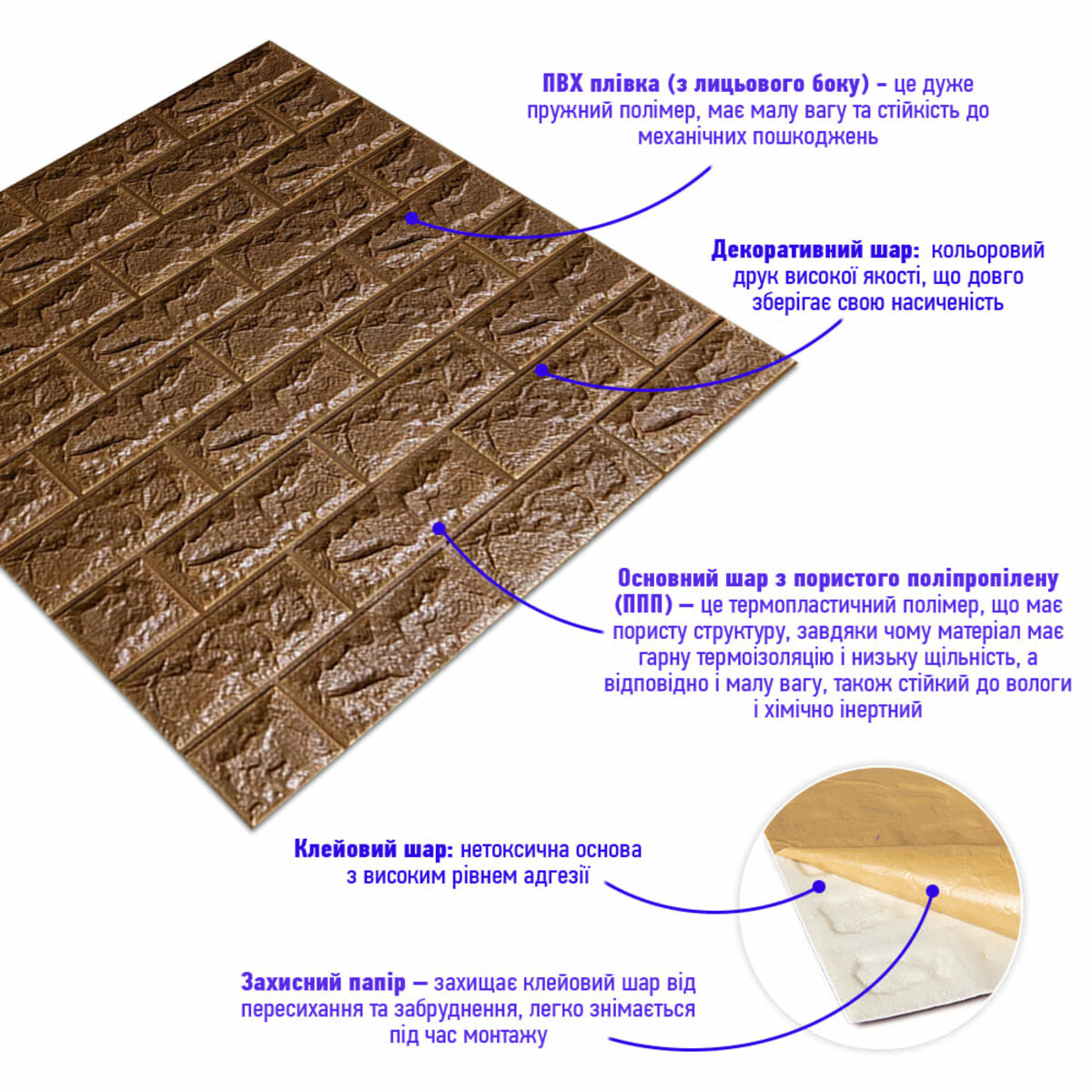 - Захисний папір – оберігає клейовий шар від пересихання та забруднення, легко знімається під час монтажу.