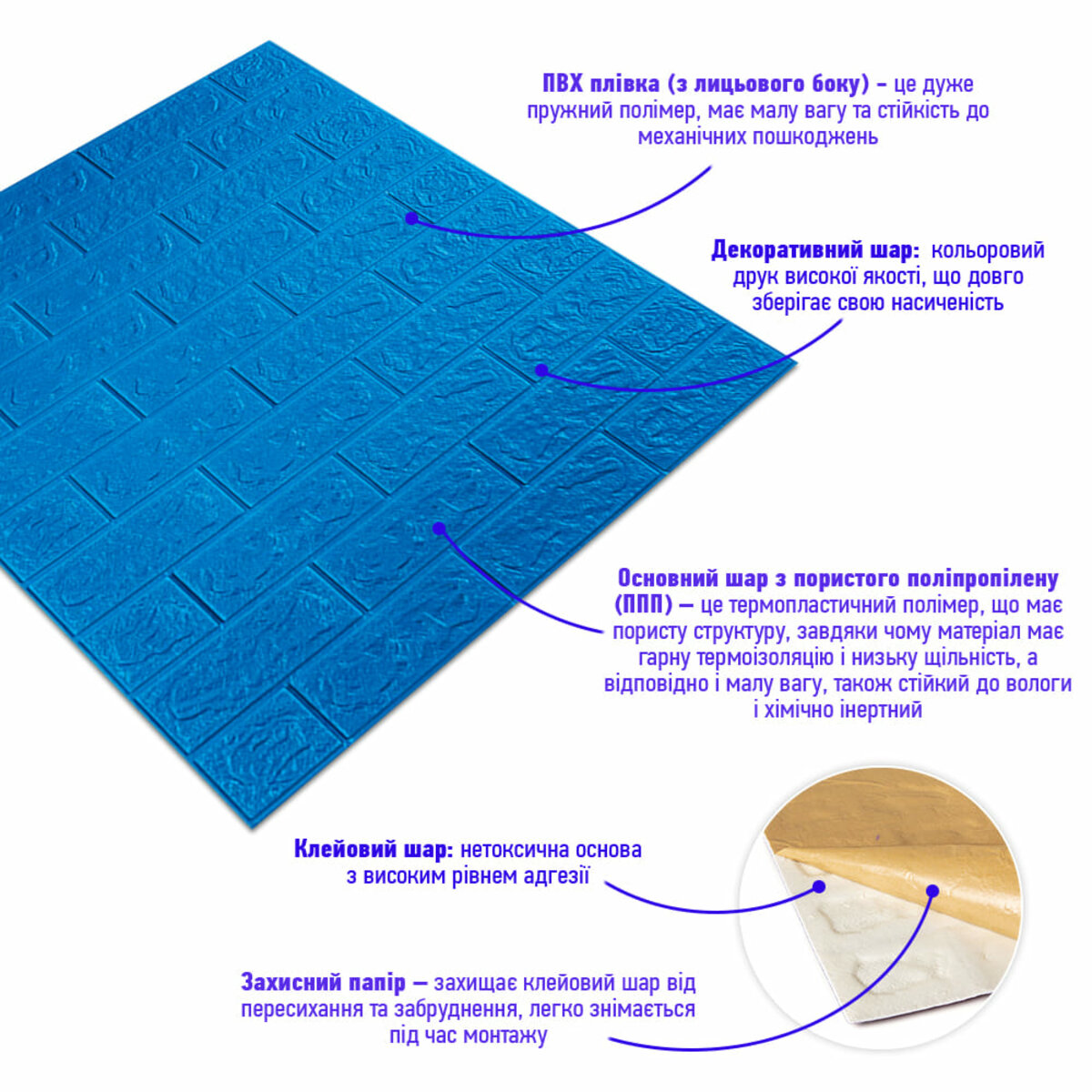- Захисний папір – оберігає клейовий шар від пересихання та забруднення, легко знімається під час монтажу.