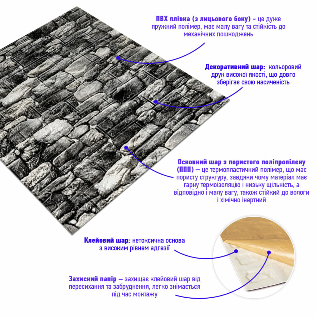 - Захисний папір – оберігає клейовий шар від пересихання та забруднення, легко знімається під час монтажу.