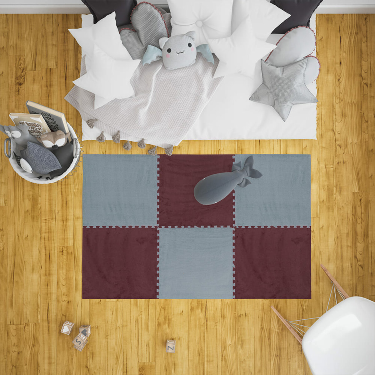 Застосування: Пазли плюшеві призначені для укладання підлогового покриття у житлових приміщеннях (вітальня, спальня або дитяча, кухня та санвузол) та у комерційних приміщеннях (дитячі садки, дитячі ігрові заклади, студії та гуртки, школи).