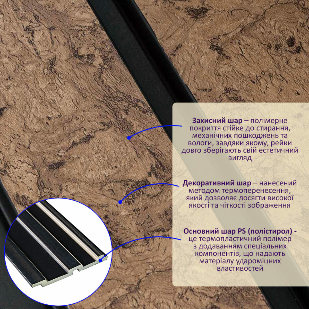 - Естетика: Декоративний шар імітує різні натуральні текстури та оздоблювальні матеріали.