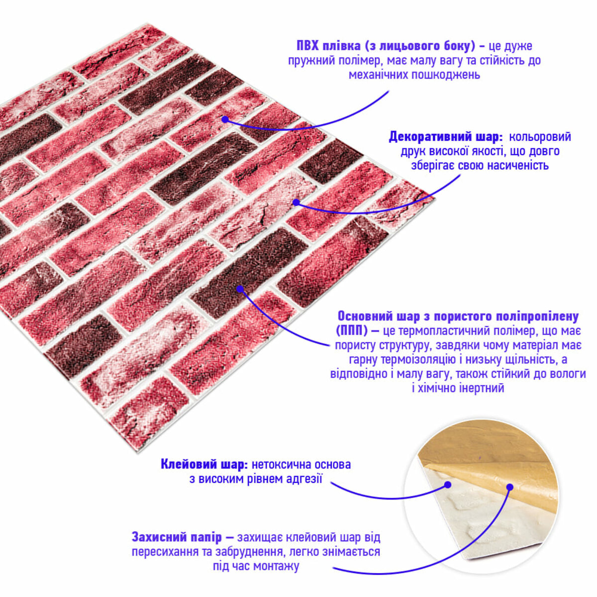 - Захисний папір – оберігає клейовий шар від пересихання та забруднення, легко знімається під час монтажу.