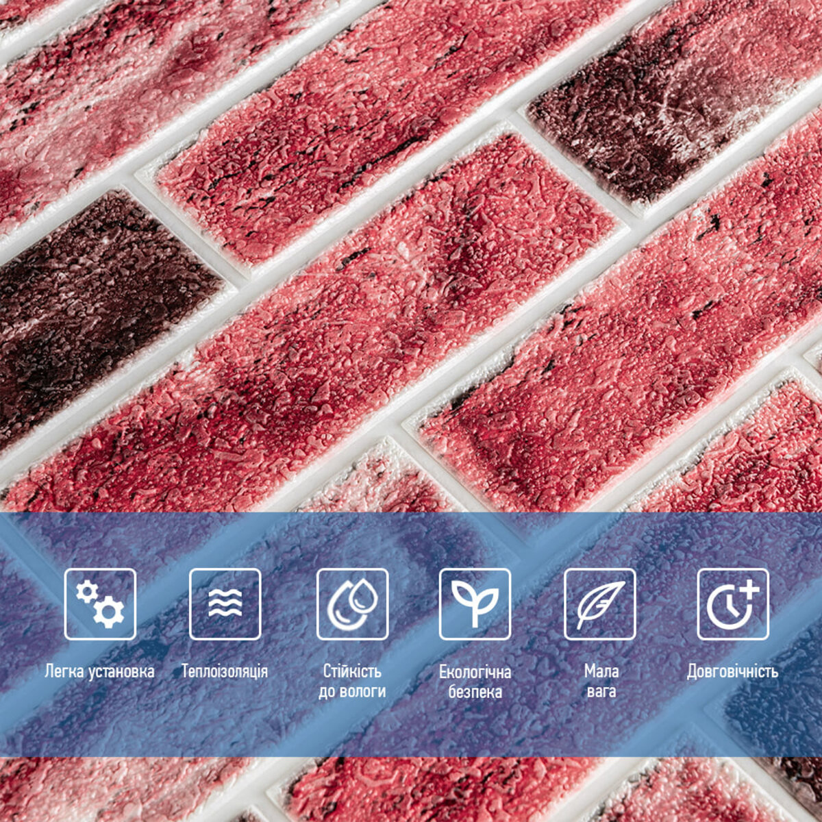 3D панелі самоклеючі – декоративне покриття для стін, виконане з легкого та міцного матеріалу – пористого поліпропілену (ППП). Основна особливість – рельєфний малюнок у вигляді цегли у широкому різноманітті кольорів та наявність клейового шару, що дозволяє встановити панелі без необхідності застосування додаткових матеріалів.