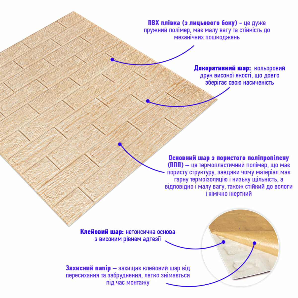 3D панелі самоклеючі – декоративне покриття для стін, виконане з легкого та міцного матеріалу – пористого поліпропілену (ППП). Основна особливість – рельєфний малюнок у вигляді цегли у широкому різноманітті кольорів та наявність клейового шару, що дозволяє встановити панелі без необхідності застосування додаткових матеріалів.