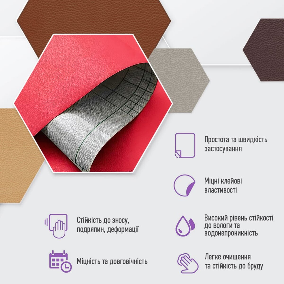 - Екологічна перевага: самоклейна екошкіра виготовляється без використання тваринного шкіряного матеріалу, тому вона є більш екологічною альтернативою натуральній шкірі.