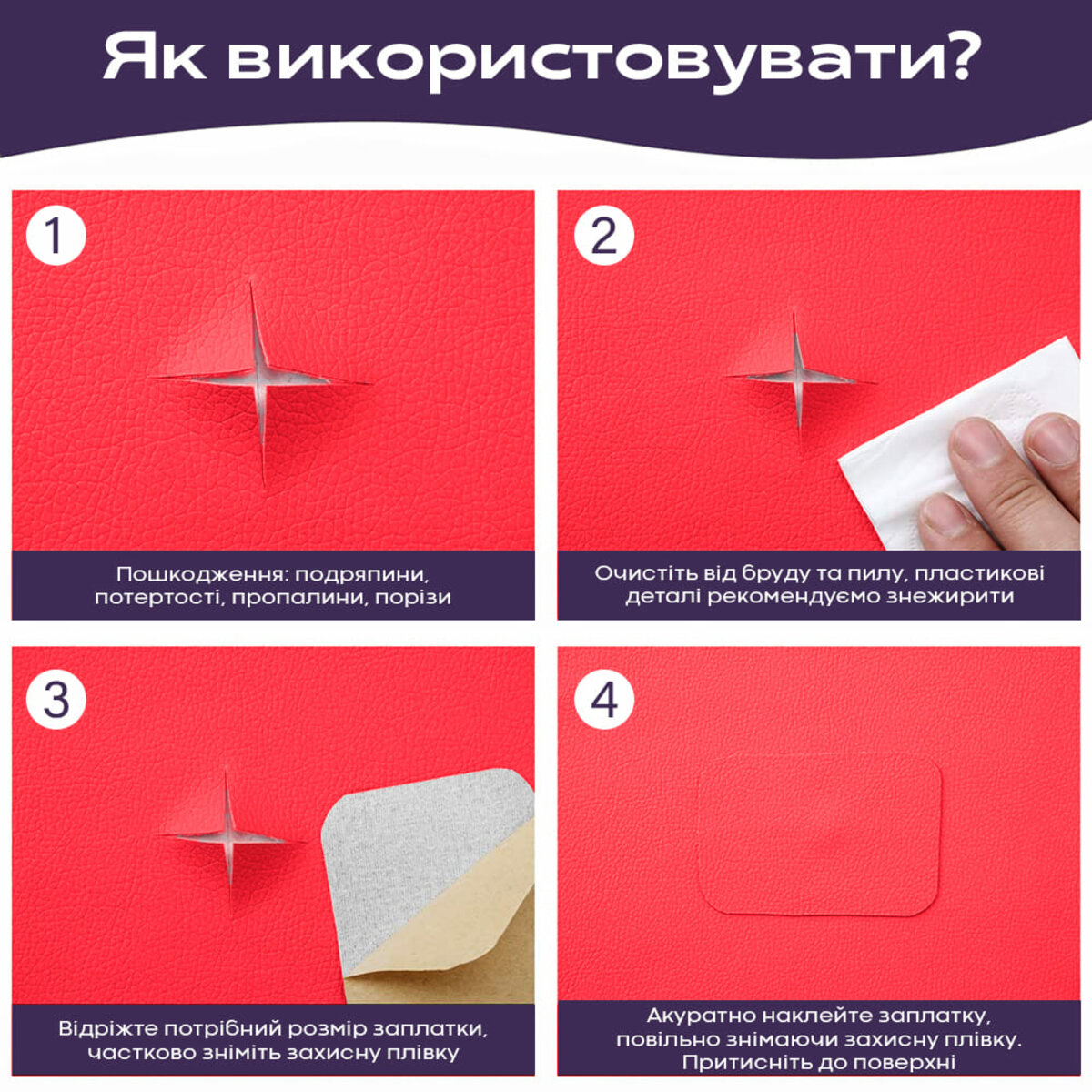 Призначення: ремонтно-оздоблювальні роботи та декорування. Матеріал може використовуватися у різноманітному ремонті дверей, м’яких меблів та стільців, деталей салонів автівок, сидінь велосипедів та мотоциклів, а також для реставрації шкіряно-галантерейної продукції та одягу.