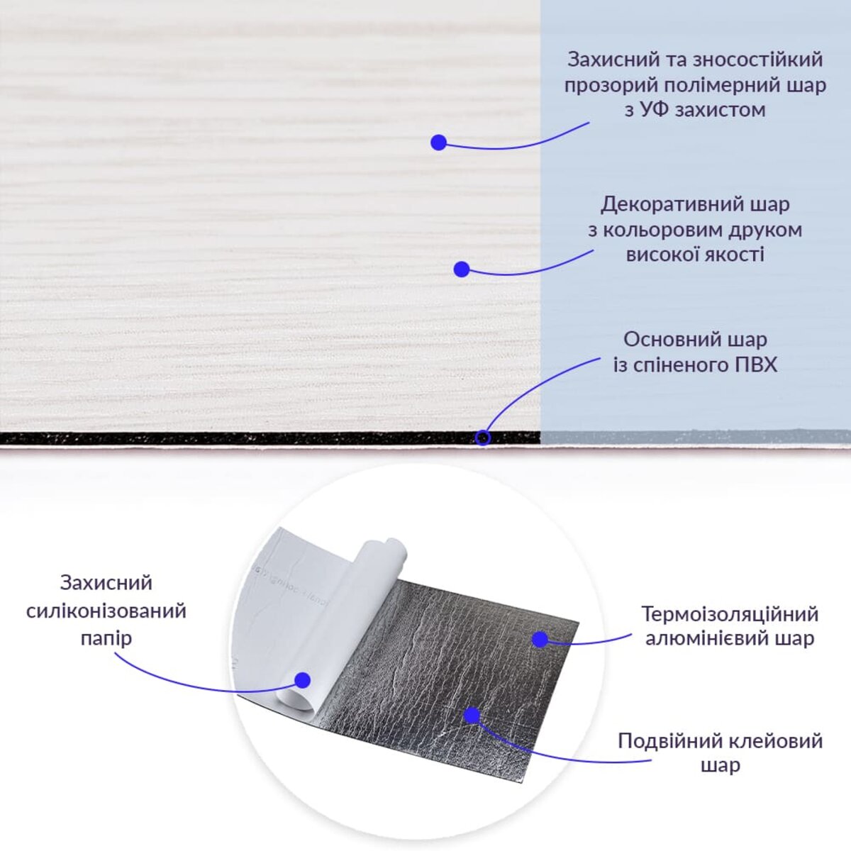 • Декоративний шар: плівка з кольоровим друком високої якості, яка повністю імітує фактуру природних матеріалів завдяки чіткому та деталізованому зображенню.