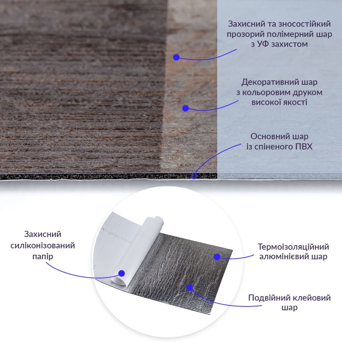 • Декоративний шар: плівка з кольоровим друком високої якості, яка повністю імітує фактуру природних матеріалів завдяки чіткому та деталізованому зображенню.