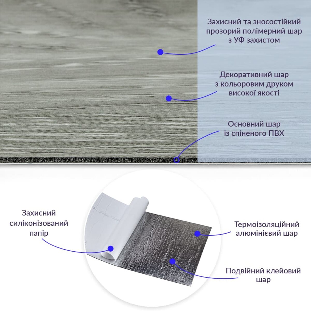 • Фольгований шар: основна властивість цього шару – відображення теплових хвиль, що дозволяє мінімізувати теплові втрати, тим самим покращити теплоізоляцію приміщення.