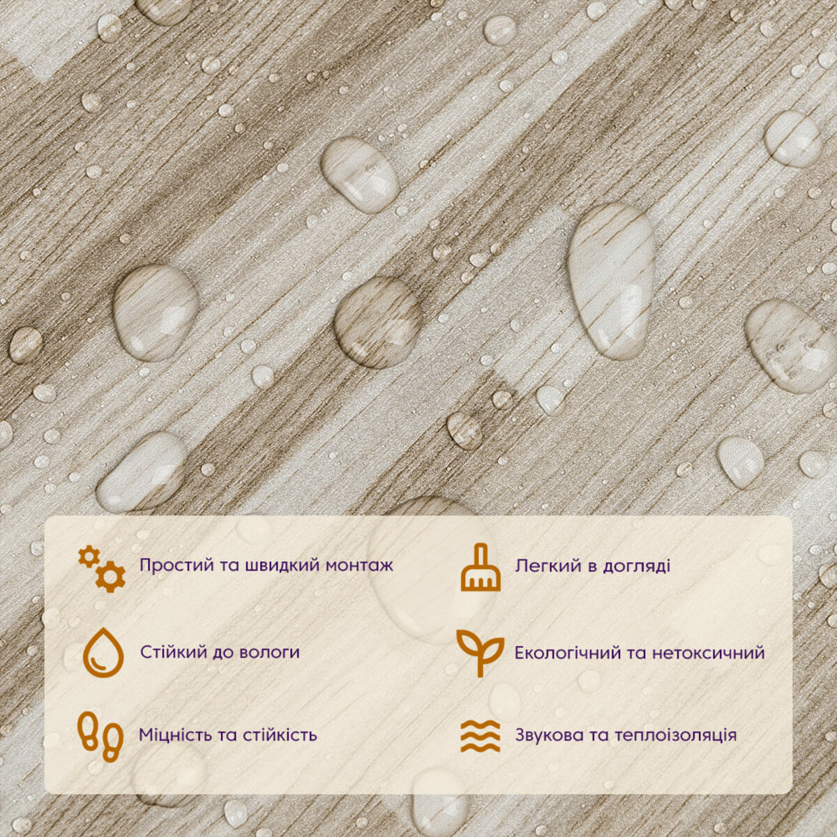 • Стійкість до вологи: вінілова плитка під ламінат стійка до вологи, що робить її відмінним вибором для кухні та інших приміщень з підвищеною вологістю, матеріал стійкий також до впливу пари та до появи плісняви.